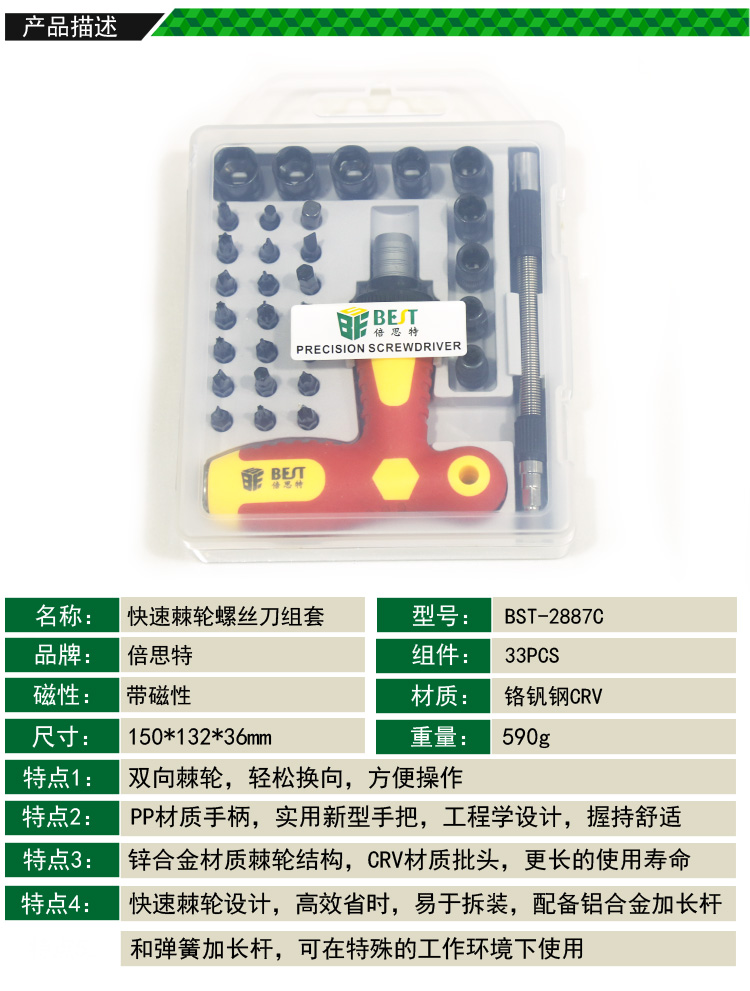 返回當(dāng)前位置: 首頁 / 產(chǎn)品中心 / BST-2887C 33件套 快速棘輪螺絲刀組套