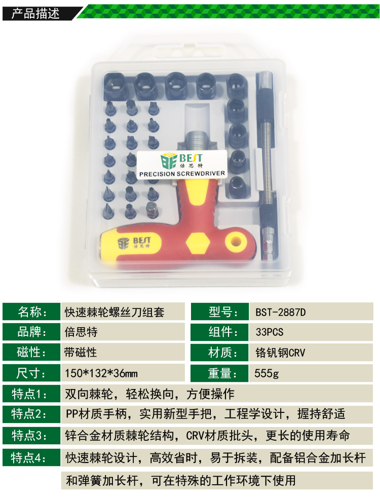 返回當(dāng)前位置: 首頁(yè) / 產(chǎn)品中心 / BST-2887D 33件套 快速棘輪螺絲刀組套
