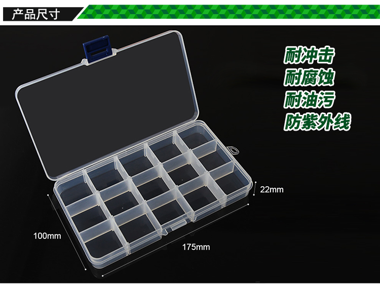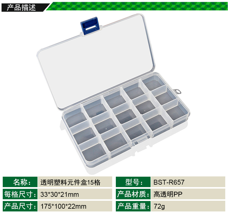 ? 產品名稱: 15格透明塑料元件盒? 產品型號: BST-R657? 產品類別: 元件盒系列
